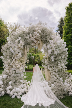 This ceremony featured an all-white floral design that highlighted the symmetry of the garden and enhanced the natural elegance of Graydon Hall, creating a serene and visually balanced setting perfect for both ceremony moments and portraits.